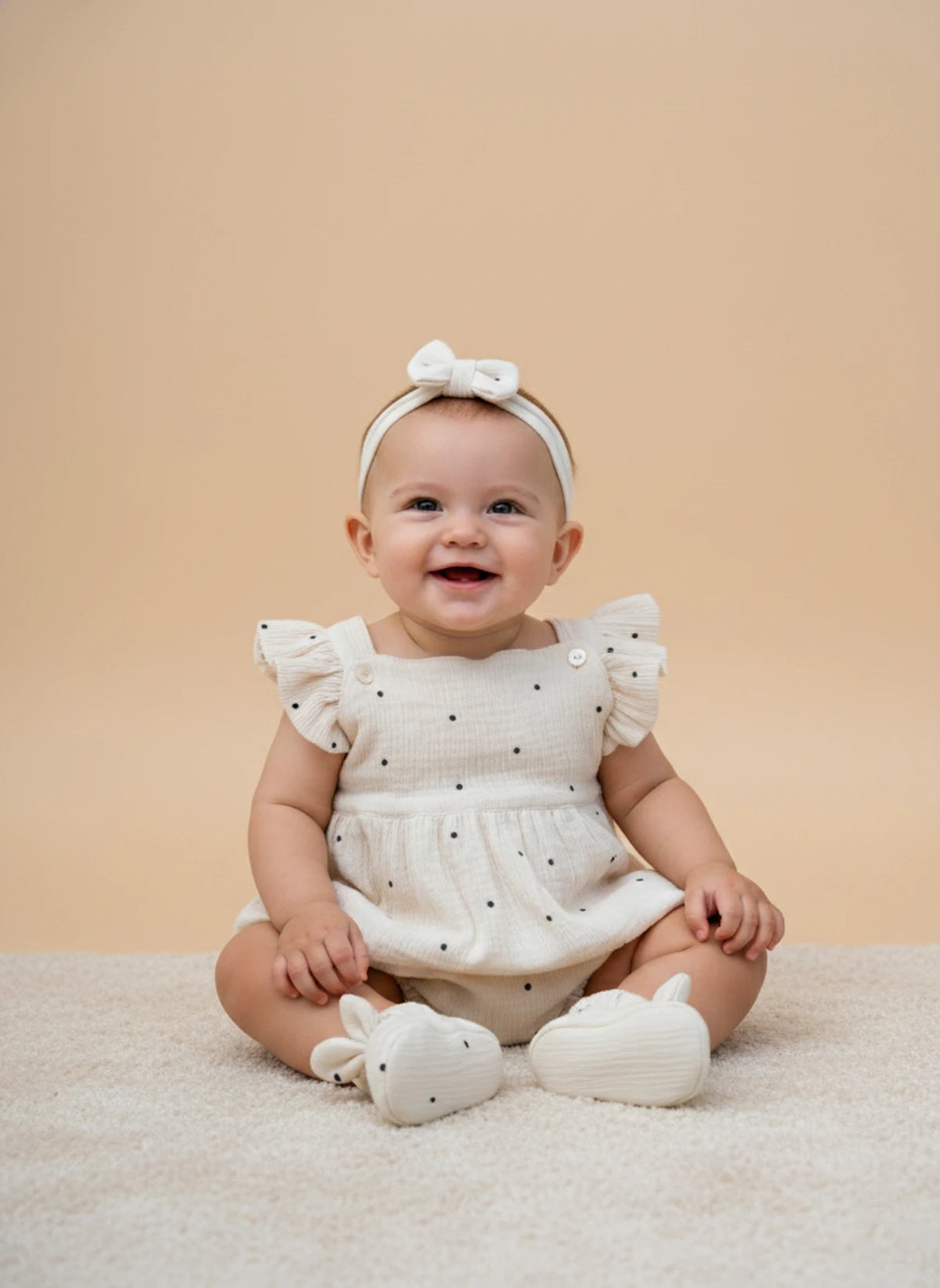 Crafted from 100% pure cotton, this adorable romper is designed to keep your little one cozy and happy all day. The double-layered muslin fabric offers soft, gentle warmth—perfect for a baby’s delicate skin. Paired with a matching accessory, it makes a picture-perfect outfit for special moments and photoshoots. Thoughtfully made for comfort, cuteness, and gifting, it’s an ideal choice for newborn celebrations and memorable keepsakes.